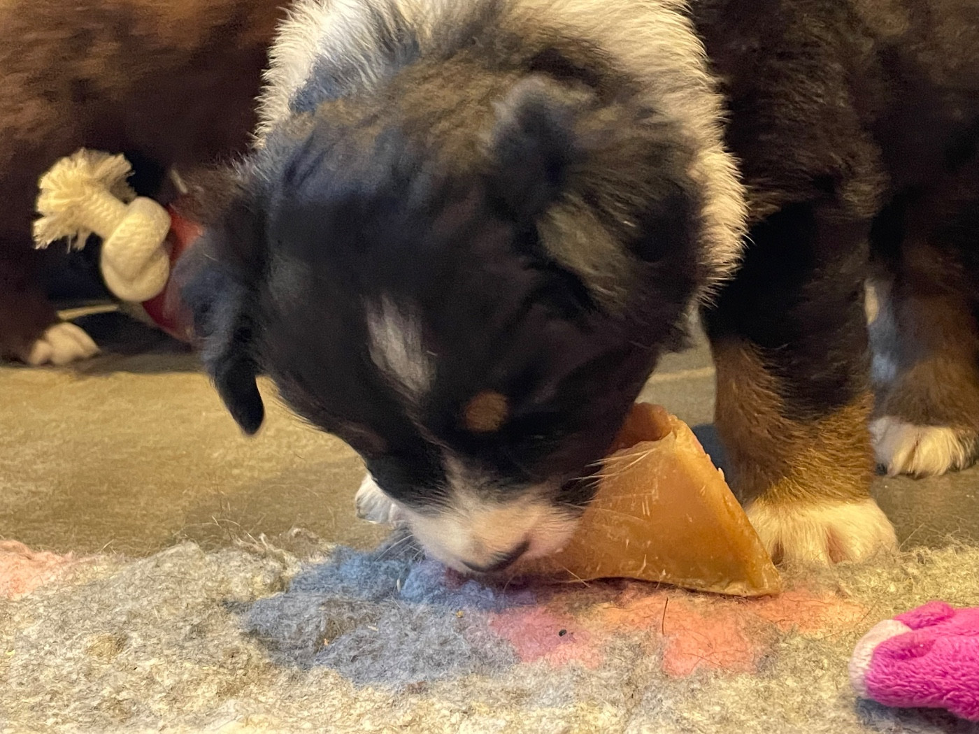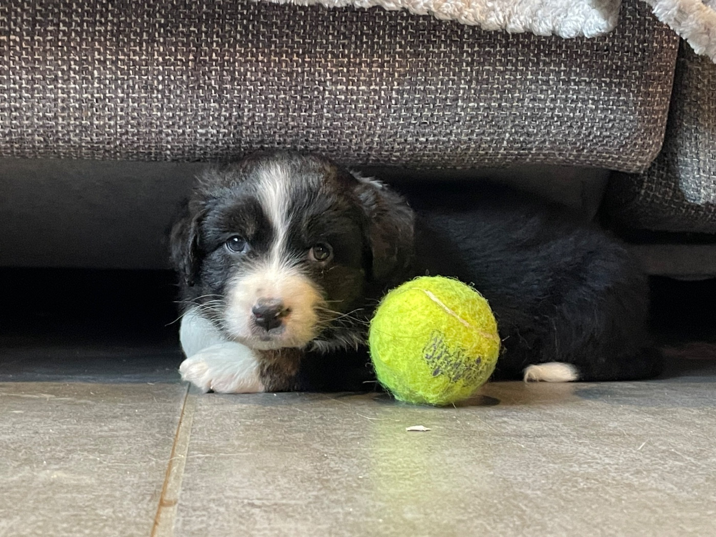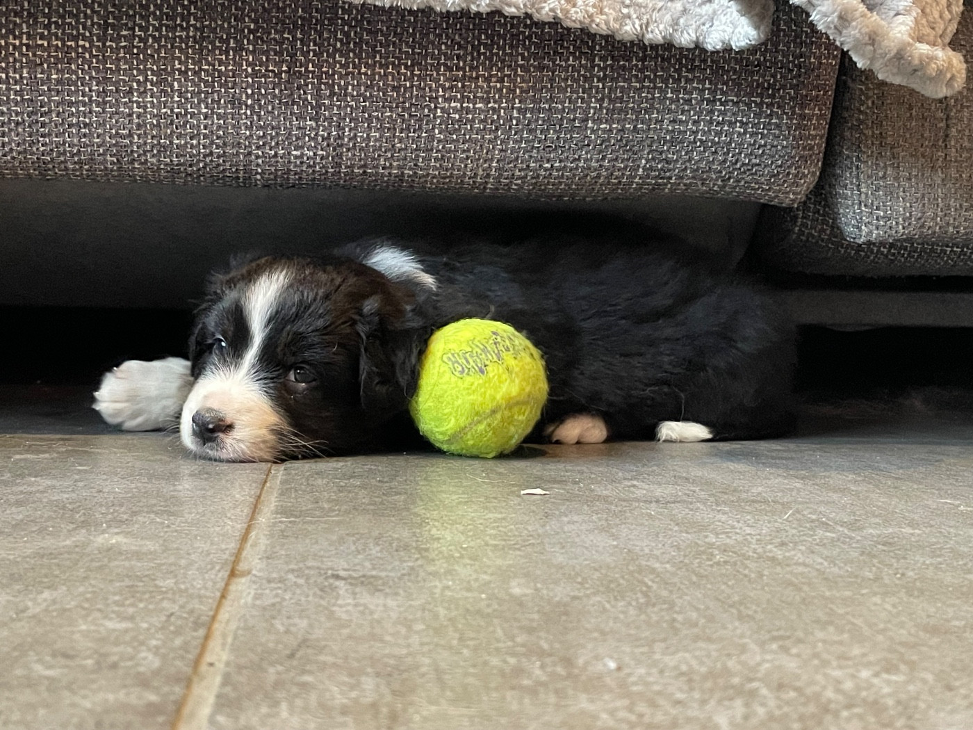 Collier complet, Sky est tonic, foufou, n y trop, n y pas assez . Le chien idéal pour une famille active. Il se révèle assez dominant.